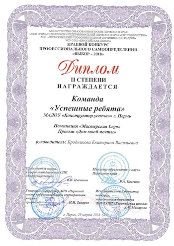 Поздравляем команду нашего дошкольного учреждения с Дипломом II степени в Краевом конкурсе профессионального самоопределения «Выбор», в номинации «Мастерская Lego».